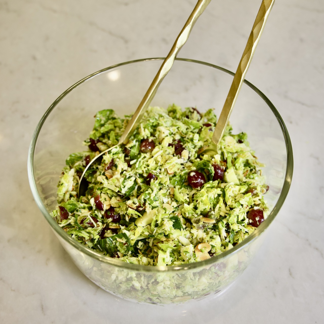 In a large bowl, combine Brussels sprouts, grapes, almonds, and Parmesan. Add the dressing and toss well.