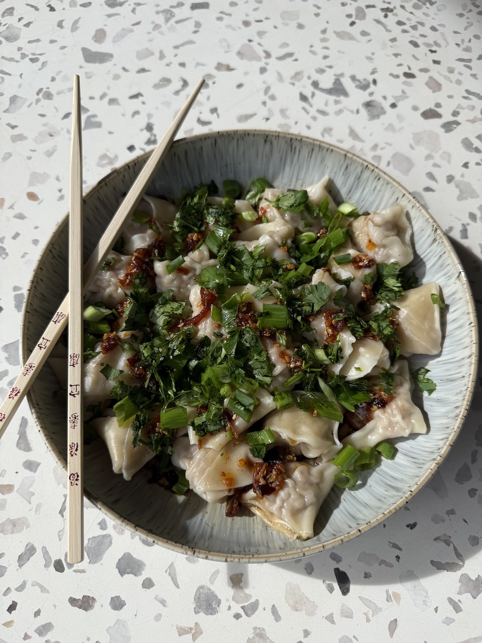 In the bottom of each serving bowl, add several spoonfuls of the sauce. You can sdd 1–2 tablespoons of the hot cooking water from the pot to loosen the sauce slightly. Transfer the hot wontons directly into the bowl and gently toss until coated. Top with chopped scallions and an extra spoonful of chili crisp if you love heat like I do.
